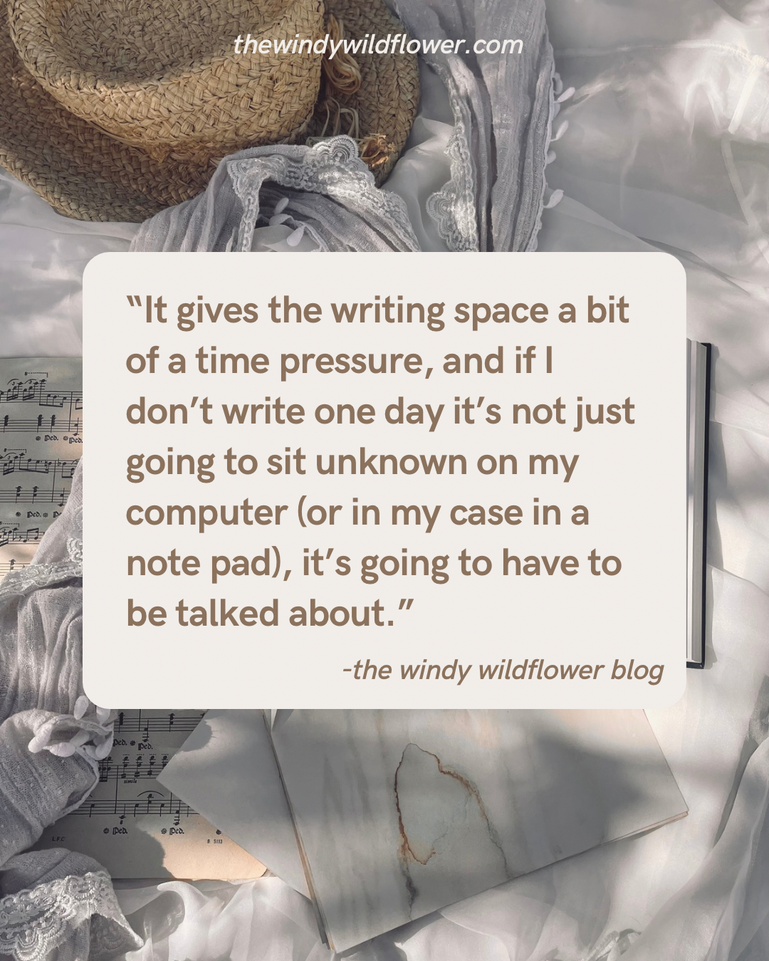 It gives the writing space a bit of a time pressure, and if I don’t write one day it’s not just going to sit unknown on my computer (or in my case in a note pad), it’s going to have to be talked about.