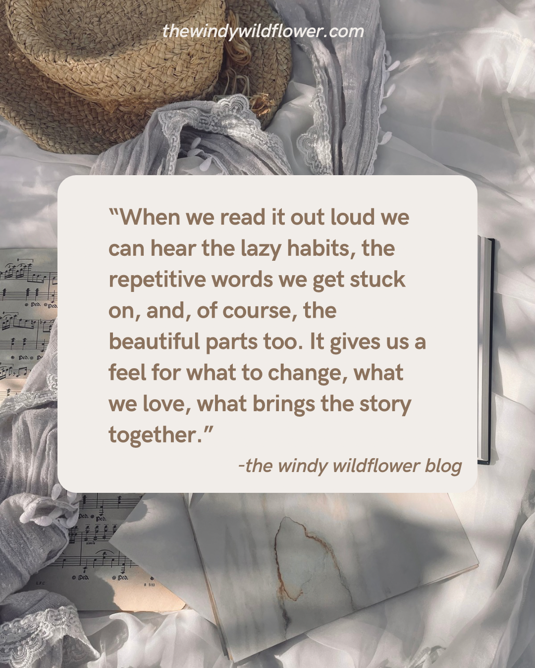 When we read it out loud we can hear the lazy habits, the repetitive words we get stuck on, and, of course, the beautiful parts too. It gives us a feel for what to change, what we love, what brings the story together.